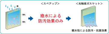スベアップ®は撥水効果があり防汚機能を持ちますが、それを更に進化させ、光触媒機能が菌やカビを吸着させないセルフクリーニングする高機能異型押出し製品。塗布ではなく同時成形ですので、コストパフォーマンスにも優れています。 |